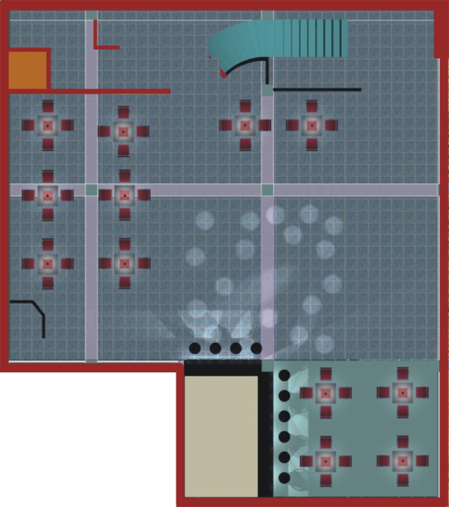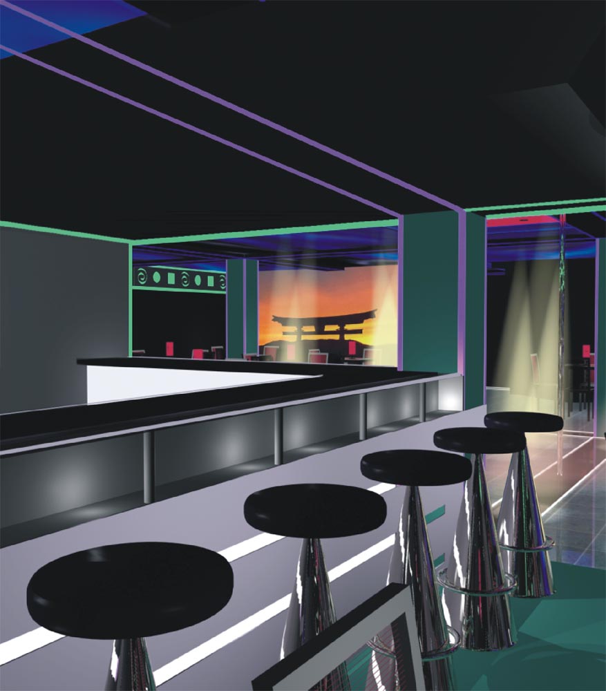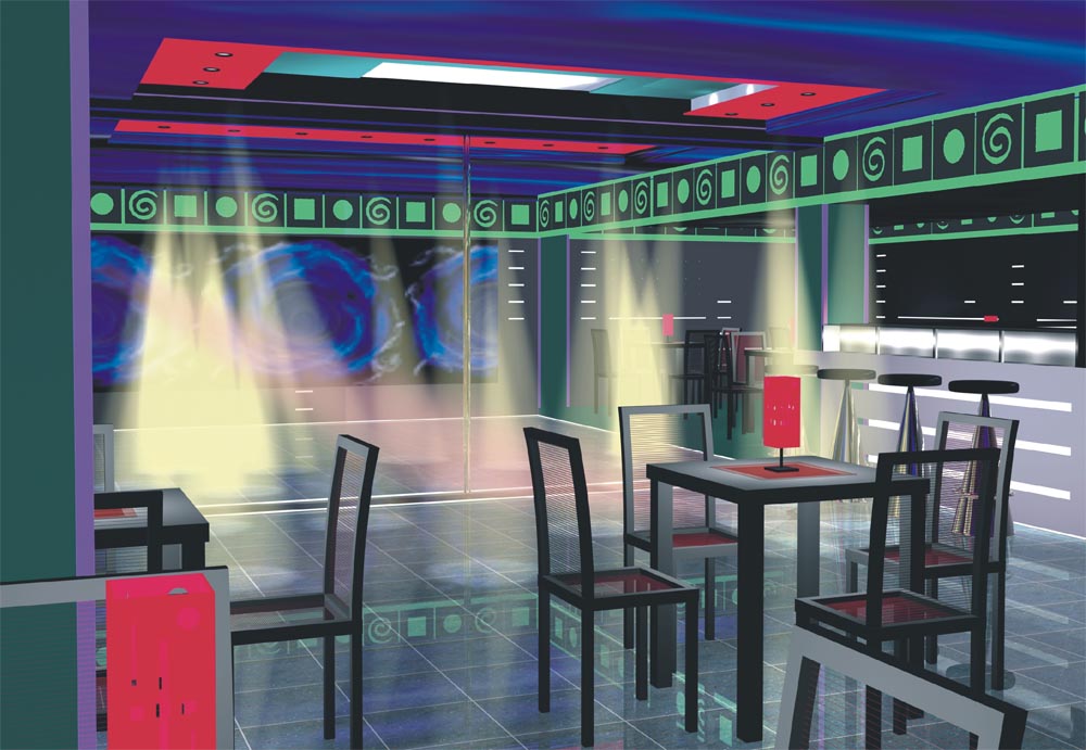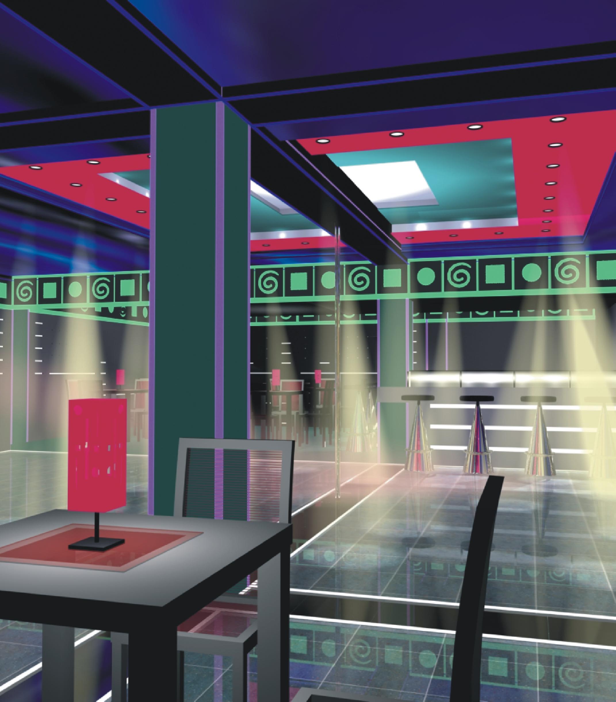 Декоративні підсвітки барноі стійки і колон доповнюють підсвічений планшет танцмайданчику в зелено-жовто-червоних миготливих виблисках трапезуючого світла.