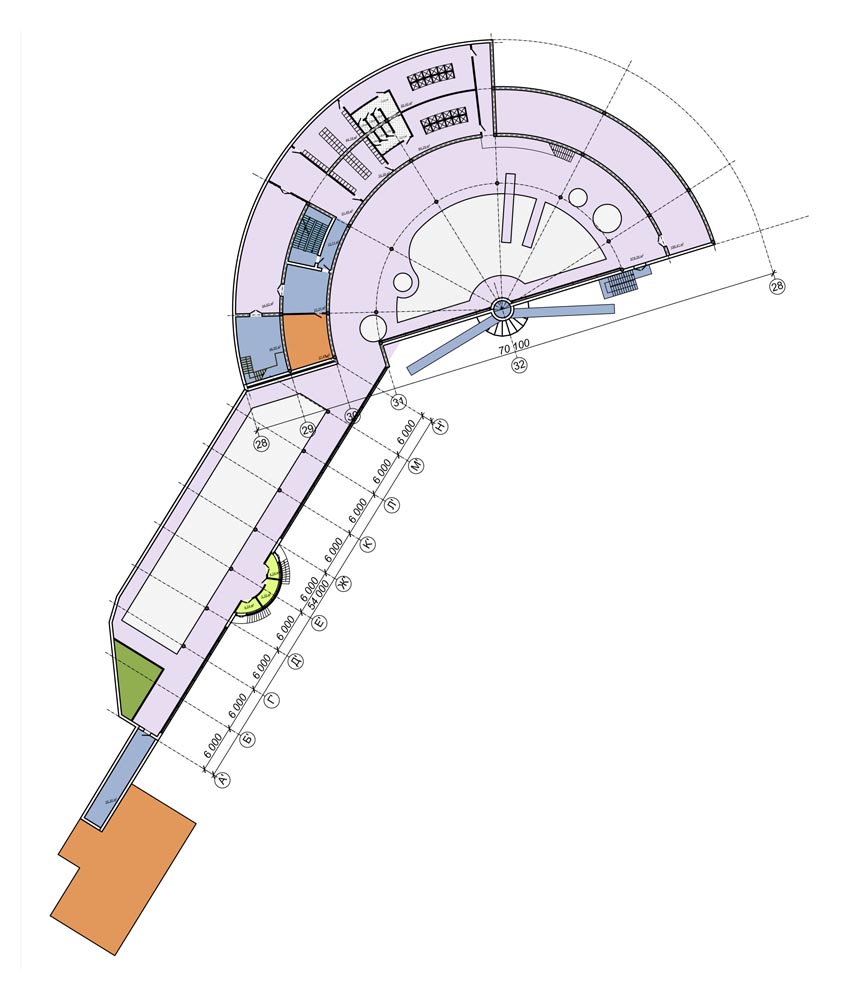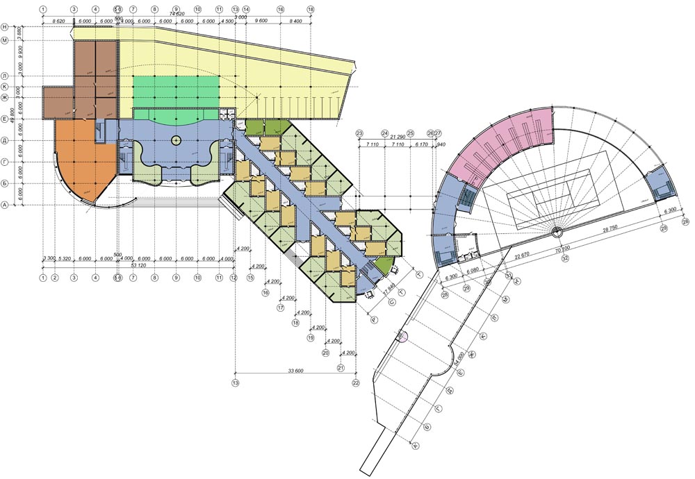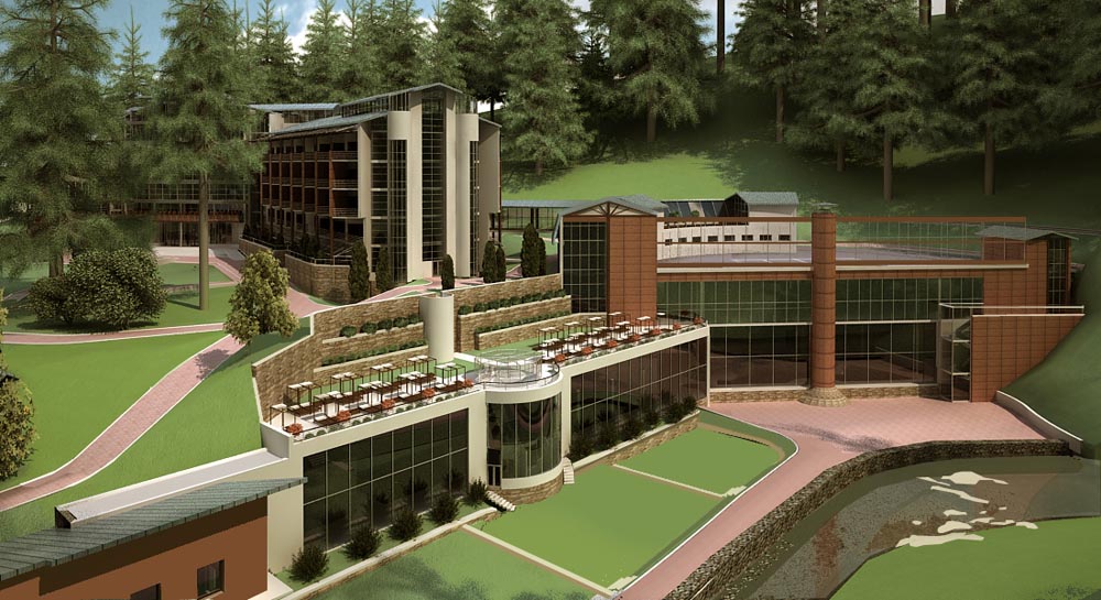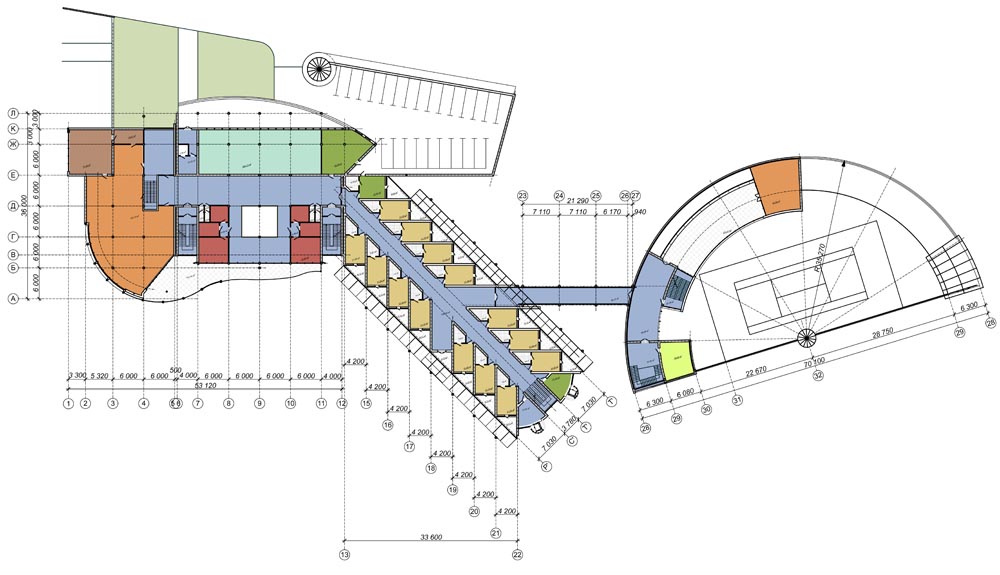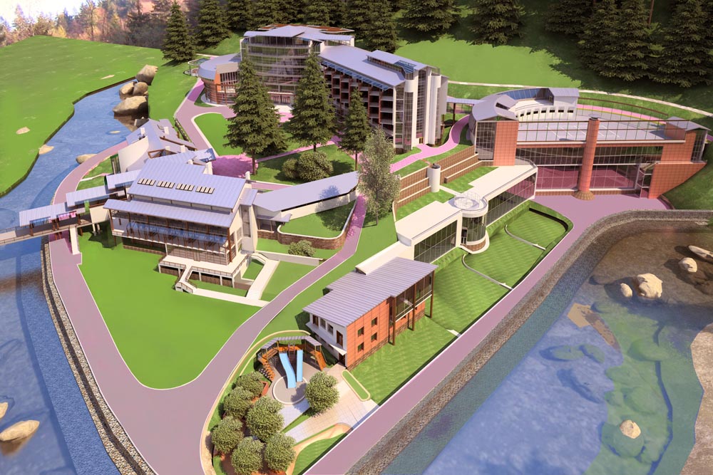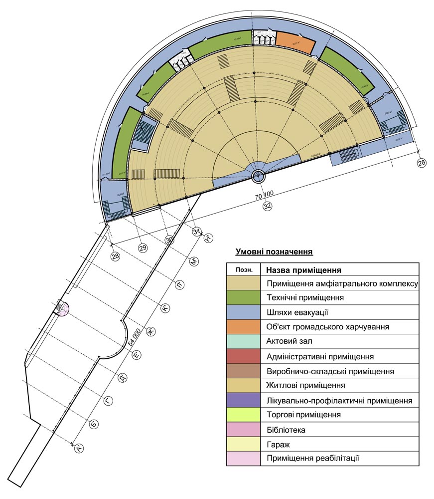 Спортивно-розважальний центр (загальною площею-8911,00м2) запроектований в амфітеатральному кратері природного походження з крутими (45-град.) еродованими, зсувонебезпечними схилами-розкритими в сторону ріки. Перепад відміток -15.0м