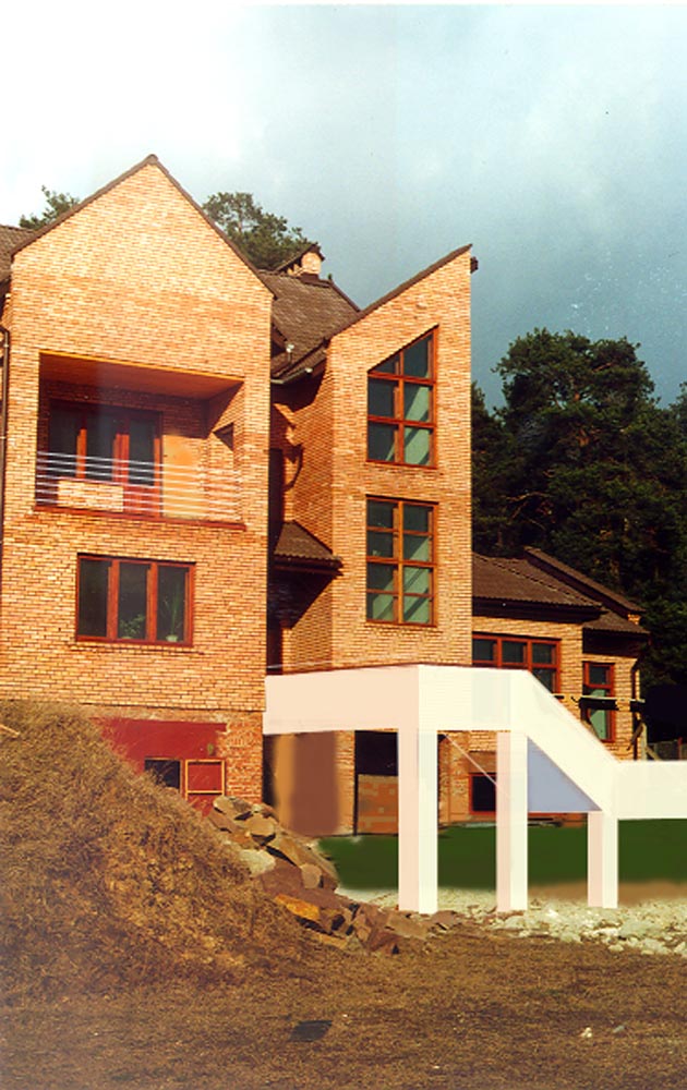 Віла збудована на пологому пагорбі на фоні соснового лісу, що примикає безпосередньо з задньої сторони будинку.