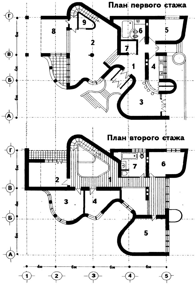 Вілла двоповерхова з підвалом і експлуатованим дахом (солярієм). Образ будинку навіяний сучасною парковою скульптурною пластикою, якої досить багато зібрано в колекції замовника.