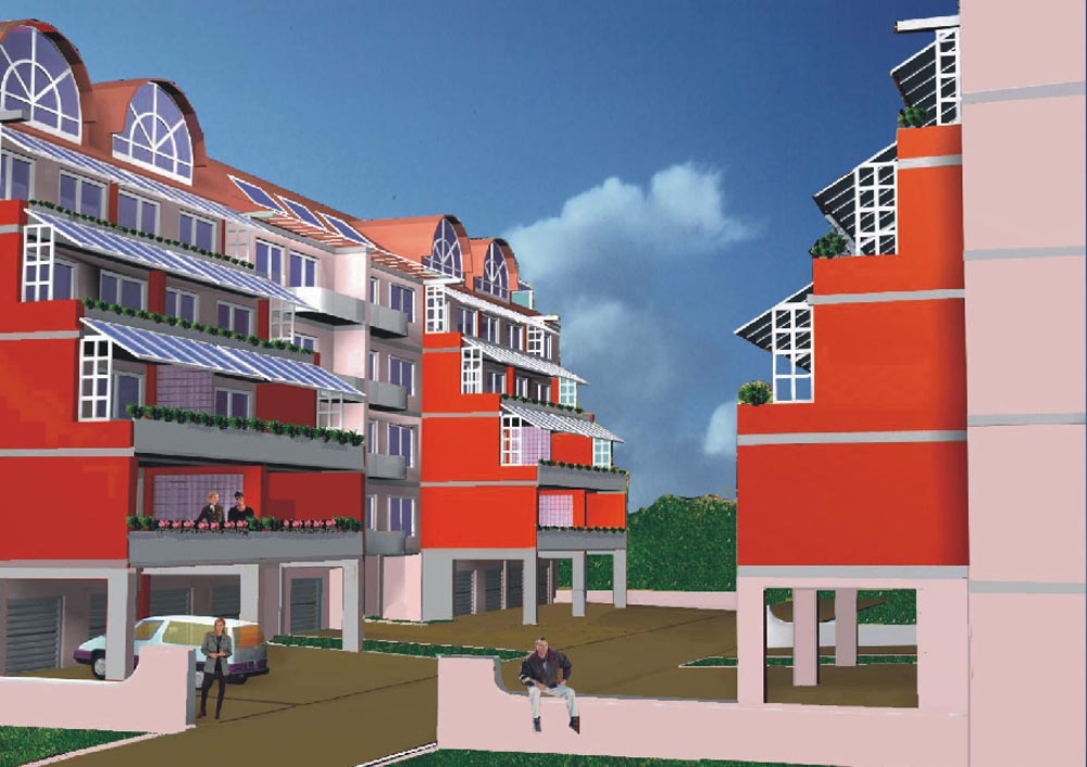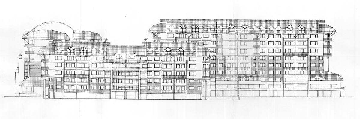 Територія під будівництво оточена з двох сторін парковою зоною з озерним ландшафтом, а з 2-х інших –житловою забудовою вул.Коновальця і вул.Гординських, з врахуванням екологічноі цінності паркового оточення житлова забудова запропонована на двох терасах з наростанням поверховості житлових будинків від акваторіі озера в сторону вул.Коновальця від 3-5 поверхів до 7-9ти. Будинки терасного типу з орієнтацією терас на паркову територію. Секція "А" склада-ється з трьох п’ятиповерхових будинків з 2-х,3-х,5-ти кімнатними квартирами. Останній 5-тий поверх запроектований мансардним з розміщенням в ньому другого рівня 5-ти кімнатних квартир.