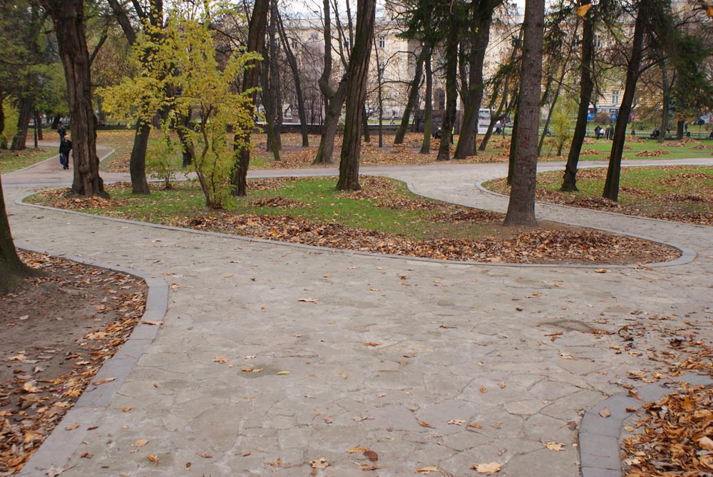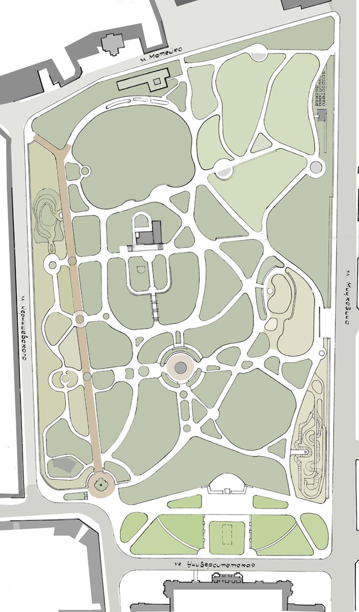Планувальна структура парку постійно змінювалась.На сьогодні це район з щільною багатофункціональною забудовою,безпосередньо примикаючий до територіі істори-ко-архітектурного заповідника.Кількість відвідувачів парку з кожним днем збільується і навантаження на 1 га його територіі вже давно перевищило його оптимально допустиму норму -80 чоловік. В результаті істотно збільшилася щільність дорожно-аллейноі сітки і кількість входів.