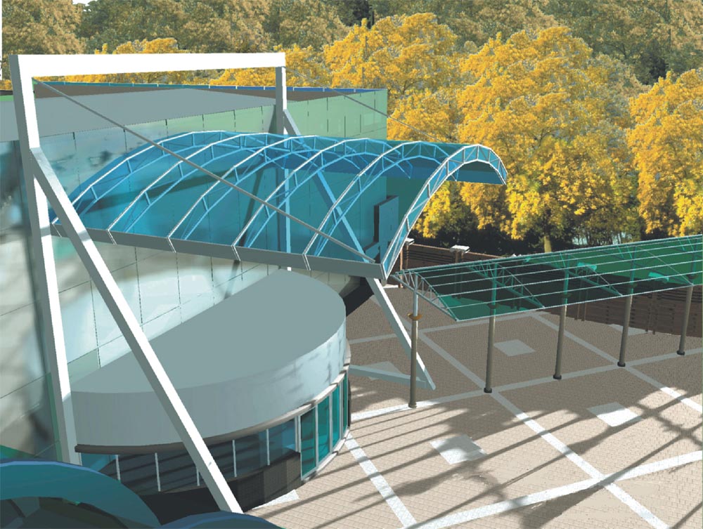 Об'єднуючим елементом комплексу є критий перехід між двома існуючими спорудами -аеровокзалом і міжнародним терміналом, з видовою терасою на посадочну полосу і кафетеріем розташованим в першім ярусі переходу.
