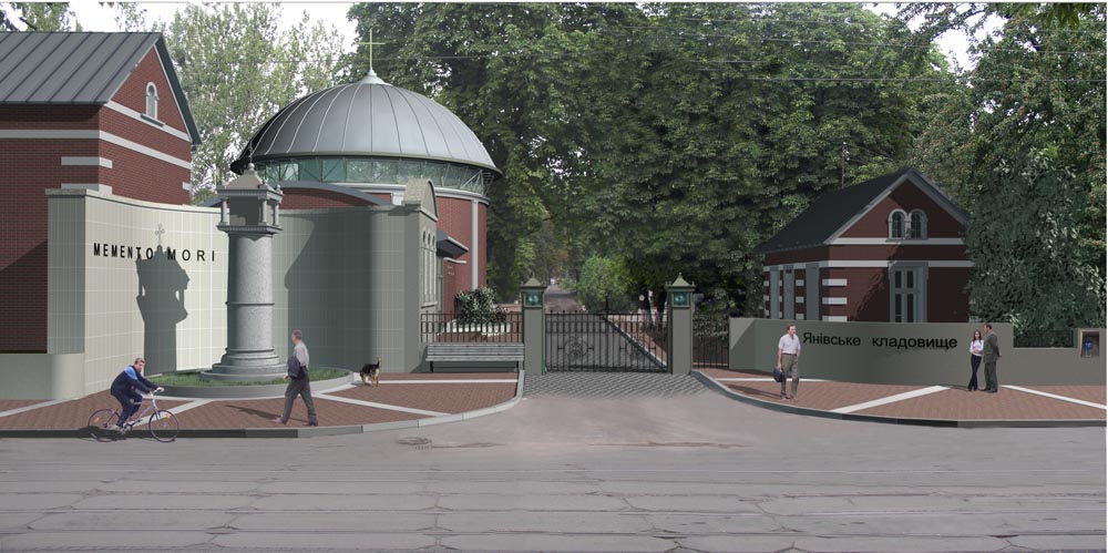 Одночасно необхідно було гармонізувати нові об’єкти будівництва з існуючим історичним середовищем – архітектурою будинку адміністраціі кладовища справа від входу, існуючою колоною-дорожнім вказівником янівського напряму з меморіальною стелою і написом «Янівське кладовище»,а також торцем існуючого фасаду цеху по виготовленню пам’ятників і огорож зліва від вхідної зони.