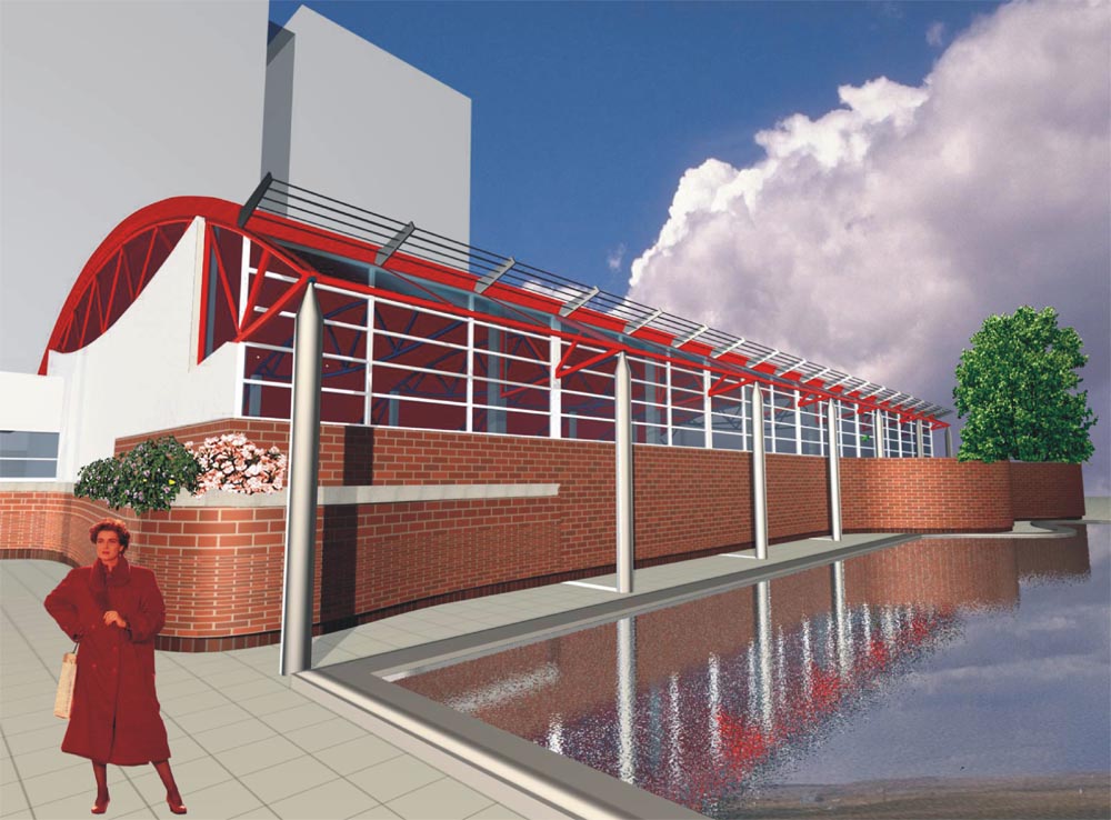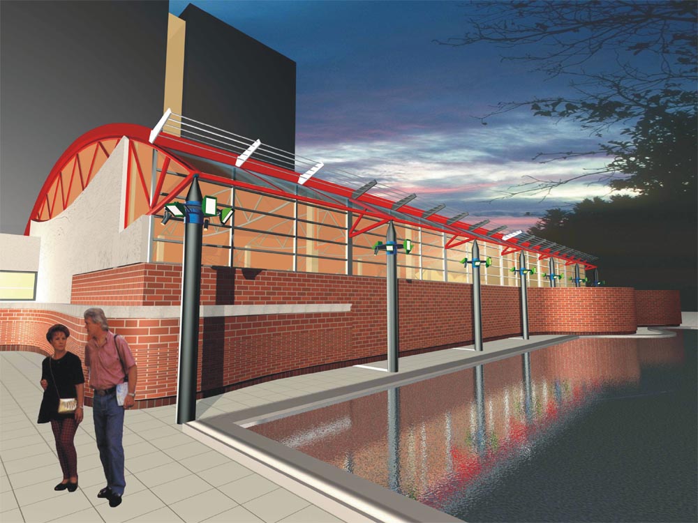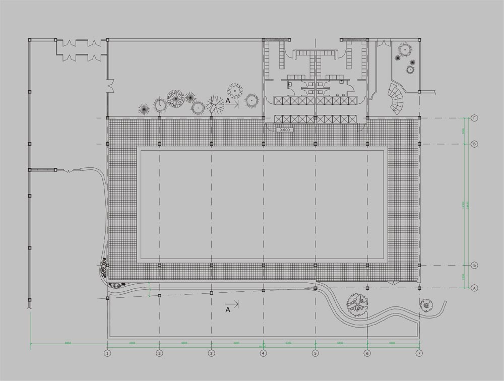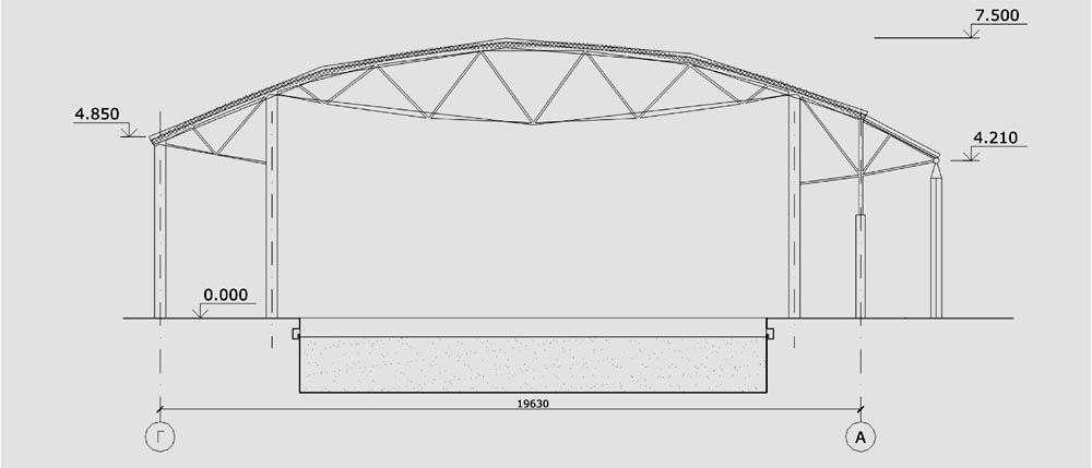 Каркас басейну-залізобетонні конструкціі. Несучі конструкціі покриття – металеві аркові ферми. Для продовження ширини покриття без збільшення висоти ферм передбачені консольні аркові півферми.