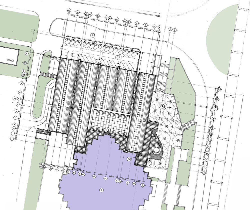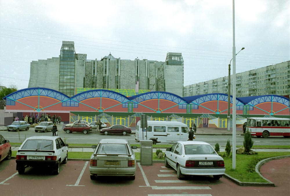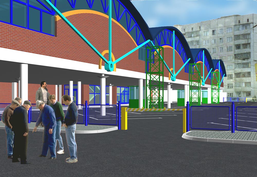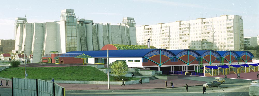 Найскладнішим завданням проекту було зведення покриття об’єму споруди,що віддана під приміщення критого ринку і складські приміщення (80х50м). Зважуючи на те,що фундаменти,а також і конструкціі існуючого стилобатного поверху ЦУМу находяться в умовах карстонебезпечних грунтів ,навантаження від надбудови другого поверху повинні бути мінімальними, а це визначило архітектоніку прийнятих конструктивних рішень.