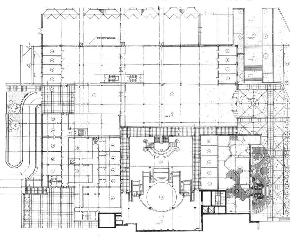 Організація торгових приміщень частини комплексу (торговий центр) навколо існуючого двору на відм. 0.000 з надбудовою над ним ще одного поверху, органічно привело до створення зимового саду-розпридільника торгових потоків. Цей простір необхідно було перекрити світлопрозорим ліхтарем, який сформував архітектурний образ комплексноі споруди торгового дому.