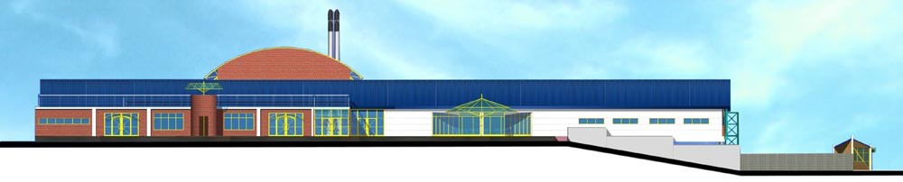 Металевий несучий ригельно- стійковий каркас другого поверху накритий системою аркових металодахів фірми "Florprofil" з влаштуванням свтлових ліхтарів освітлення на коньках арок. Ці дахи є самонесучими і не вимагають додаткових несучих ферм, що значно здешевлює будівництво ,а також зменшує навантаження на конструкціі першого поверху і фундаменти. Стінові заповнення також є легкими і запроектовані в сендвічпанелях,які монтуються на несучий металокаркас.