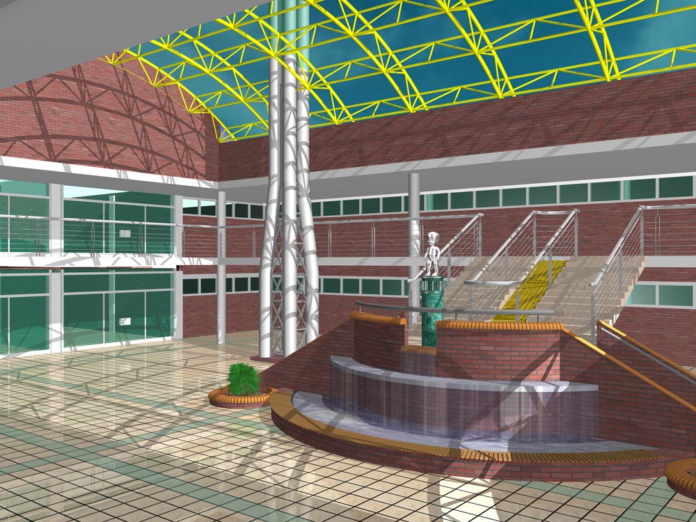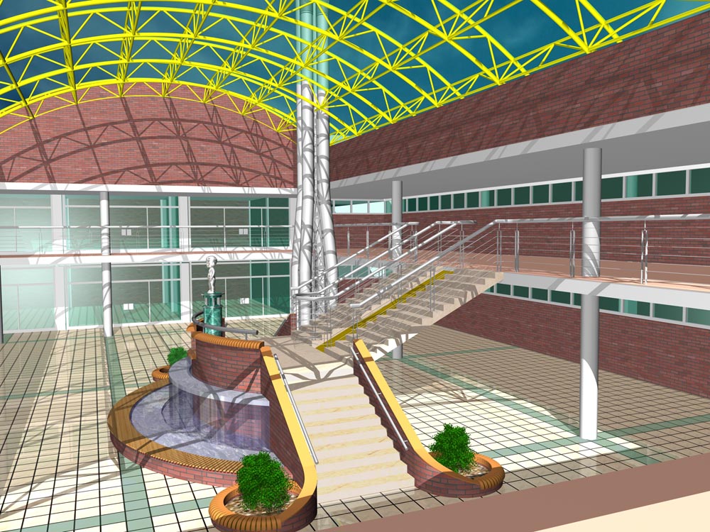 - двоповерхового приміщення торгового центру , сформованого навколо функціонально необхідного хола-розпридільника в формі атріума-зимового саду. На першому рівні атріума "зимовий сад" розташований торговий комплекс "Світ дитинства",який складається з іграшкового магазину, дитячого кафе на 24 посадкових місця, а також кафе-морозиво "Ігровий майданчик".