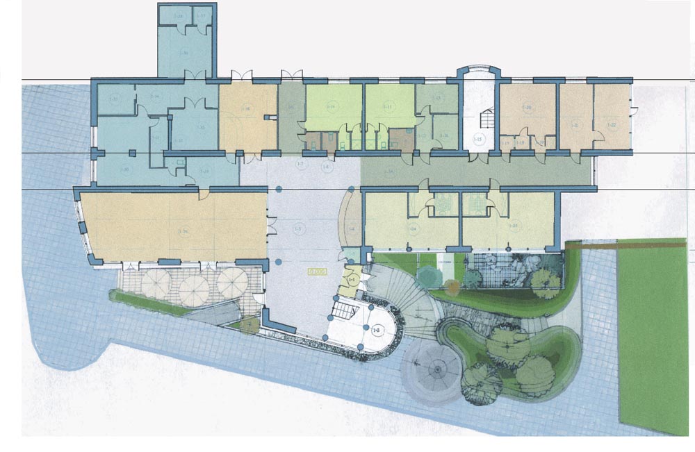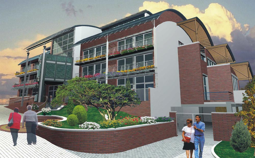 На першому поверсі запроектовані 3 номери класу “Люкс” з 2-х і 3-и кімнатними апартаментами, тінистими терасами обсадженими декоративними деревами.