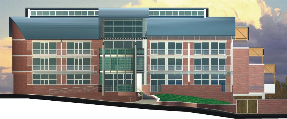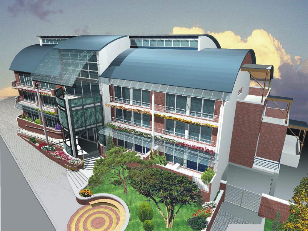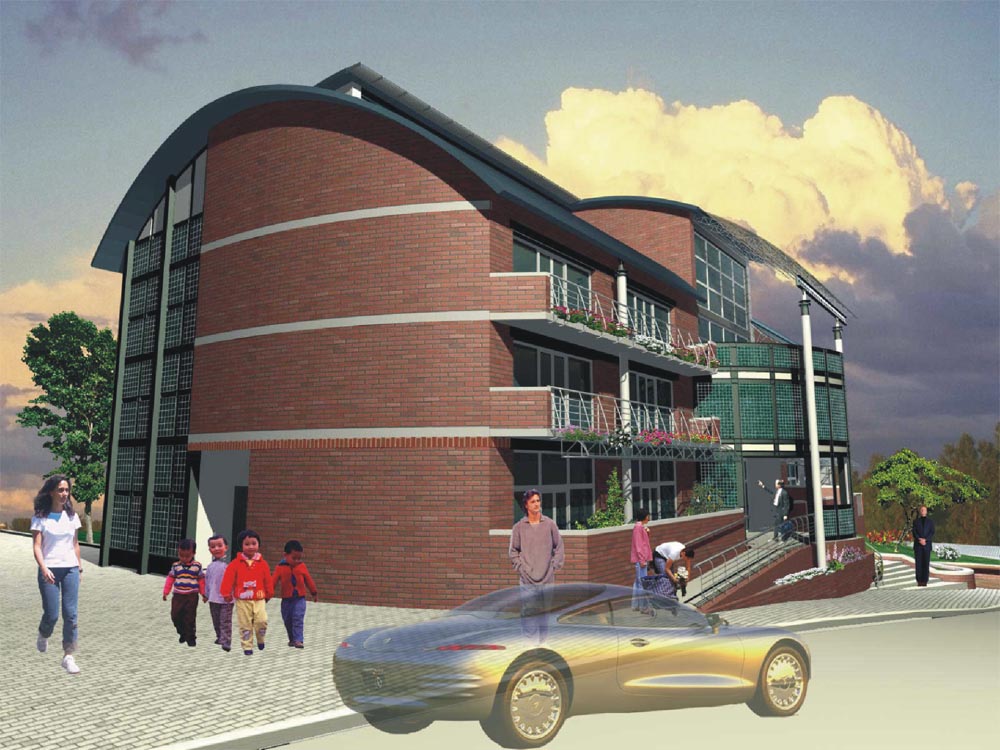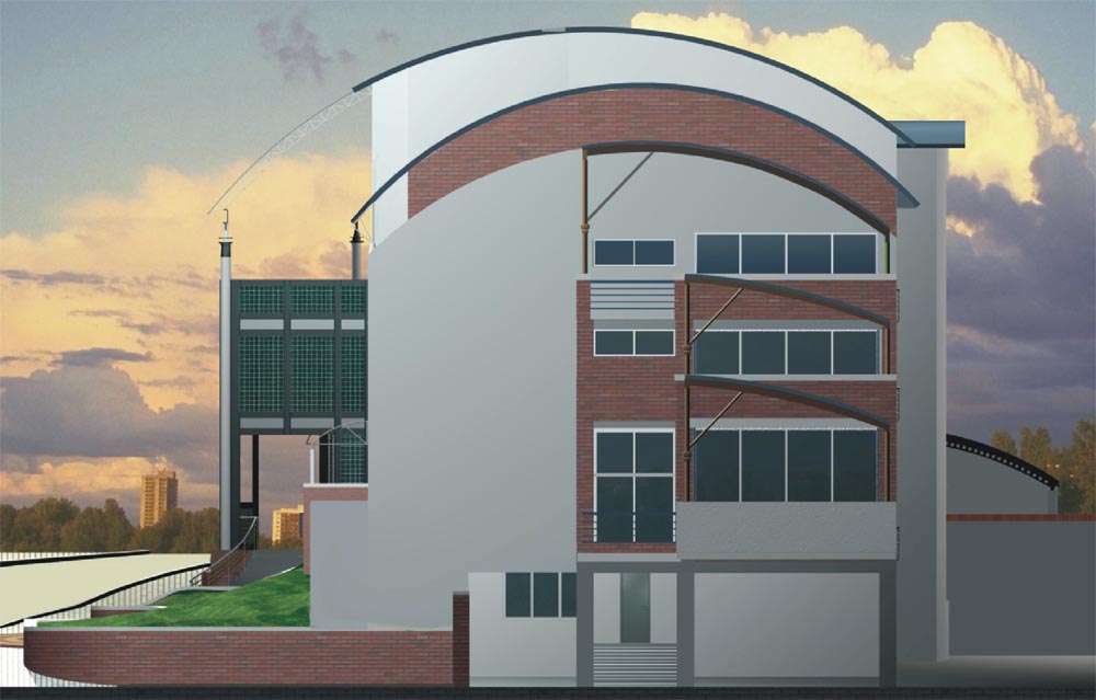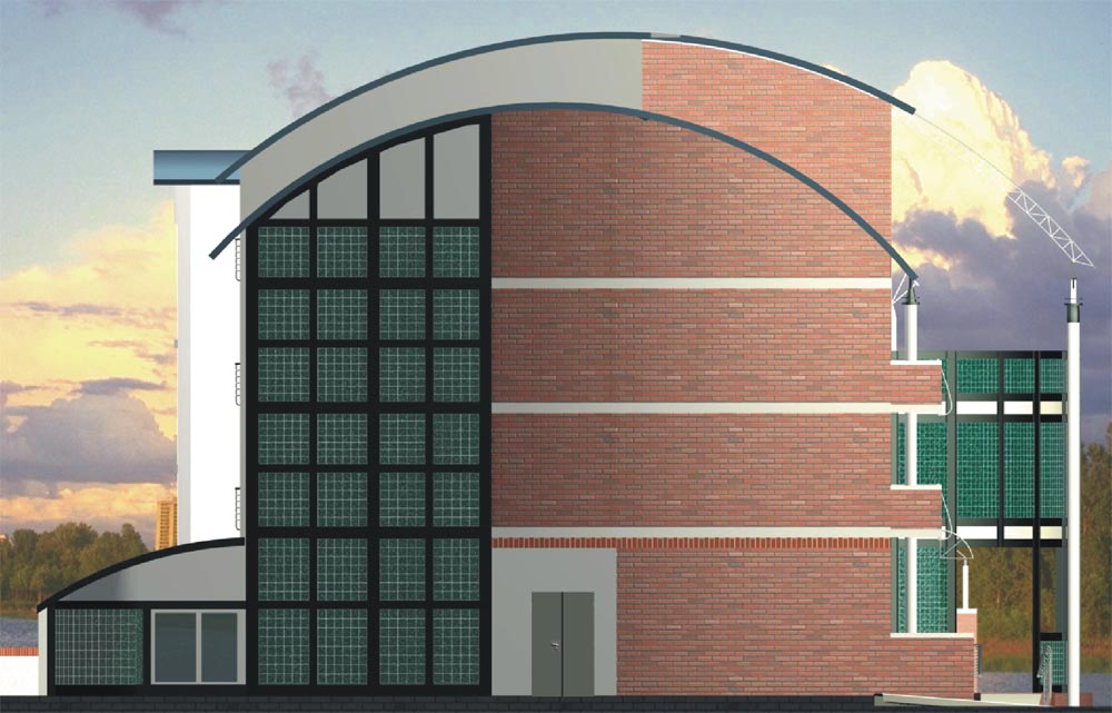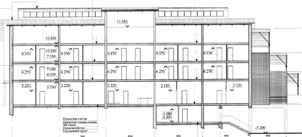 Несучий каркас виконаний з керамічних пустотних блоків обличкованих зовні керамічною плиткою теракотового кольору з розшивкою швів під “личкову цеглу”Сходові кліті і вестибюль другого поверху виконані в вітроблоках по монолітному каркасу з армованою перевязкою швів.