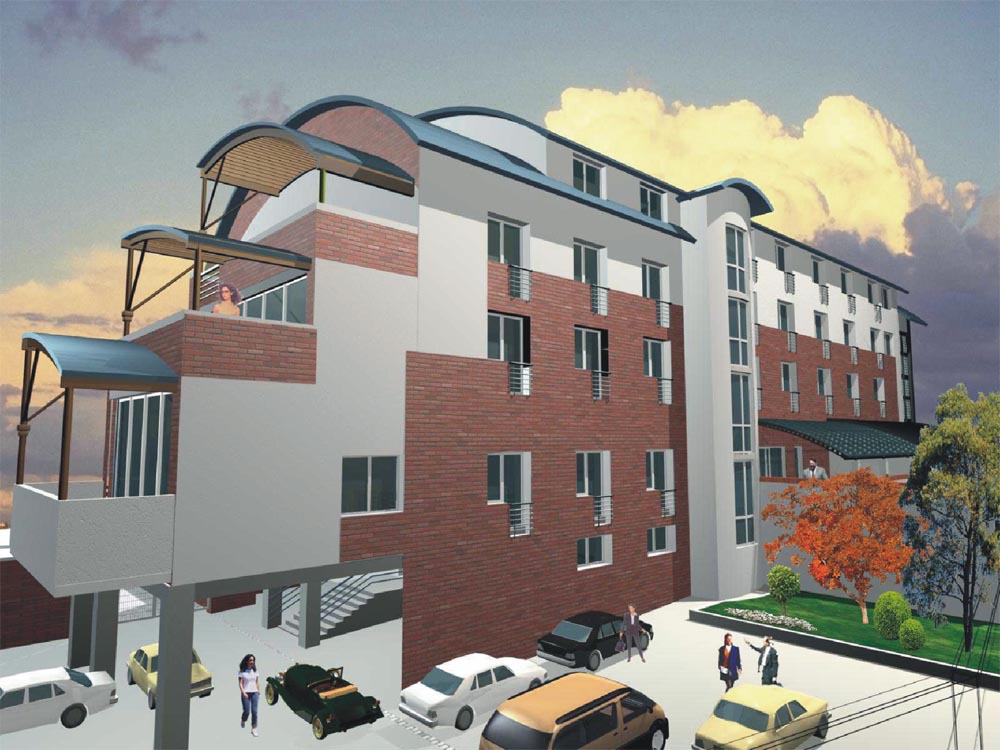 Накриття готелю запроектоване в дахових конструкціях “Аркон” по металевих аркових фермах. Перепад відміток на ділянці будівництва готелю по головному фасаду становить-3.5м,що дало можливість організувати перед головним входом терасний сад на підпорних стінах.