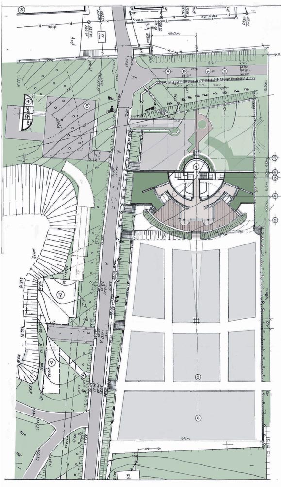 Природна ділянка немає амфітеатрального ухилу для створення оптимального кута зору при огляді сценічного дійства, тому проектом передбачається створення штучного амфітеатру за рахунок підсипки землі, вибраноі при влаштуванні підвалу кафетерію з частковим підняттям задніх ярусів на металевий каркас.