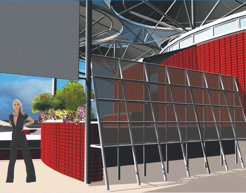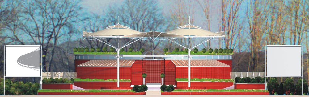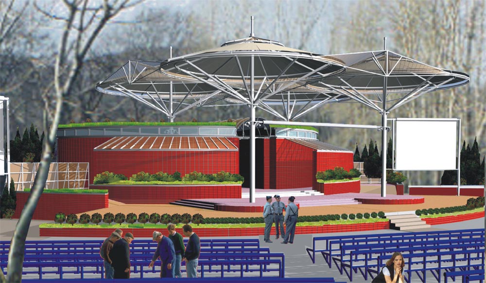 Білосніжні гіганські “парасолі-кульбабки”, як у казці “Незнайка в краіні квітів”-накривають співочих дітей ,захищаючи від сонячноі спеки-влітку,від дощу-восени. Підсилюють образ “краіни квітів”рясно уквітчана декоративними чагарниками червоно-коричнева стінка огородження куліс,накрита зверху прозорим дашком. Ще вище- з відступом,створюючи образ терасованоі червоноглиняноі гори,зарослоі декоративними чагарниками запроектований блок артистичних вбирален з кафетерієм. Майже під самим дашком –тентом “кульбабок” на вершині "цієі гори” рясно виростають найпишніші ,найяскравіші квіти терасного саду –кафетерію. Розрізає нижню терасу навпіл по центральній осі головного виходу на сцену –“грот”, створений симетричними стінками куліс . Рекреаційно-відпочинкова функція співочого комплексу надихає образи ландшафного характеру максимально наближені до оточуючого природного середовища.