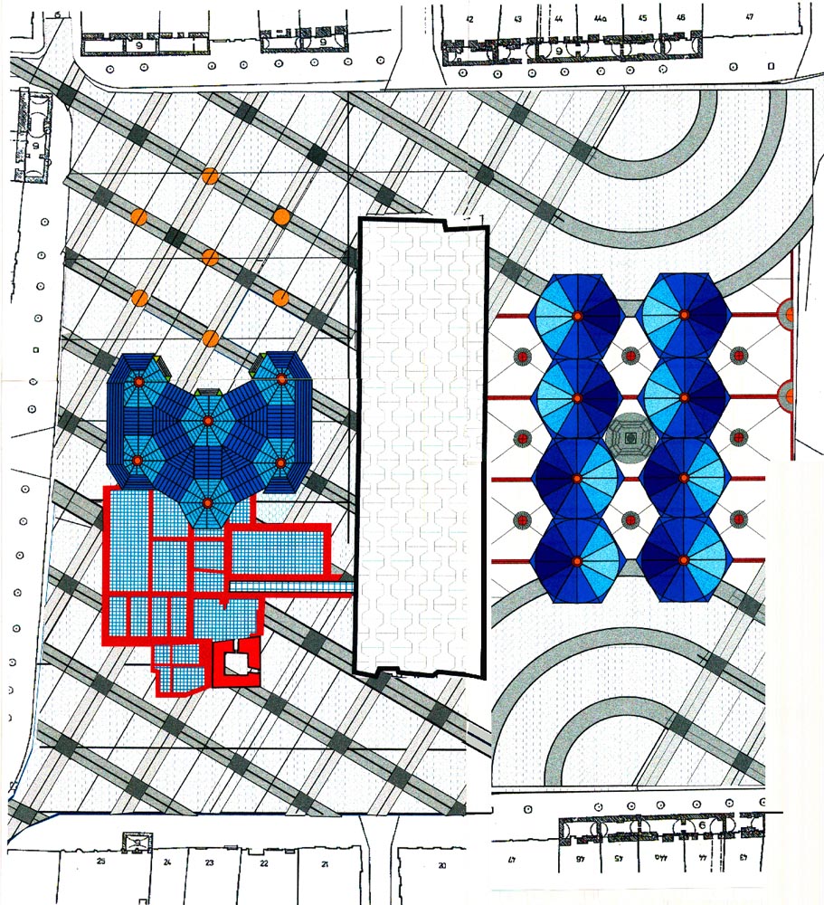 Для реалізаціі ідеі “віртуальна реальність” використаний психофізичний принцип максимального контрасту, коли від динамічного дійства виростаючоі з під бруківки старовинноі площі “ сяючоі хромованими елементами космічноі конструкціі” несучоі парасольку гільзи,так і від застосування легких,склопрозорих несучих елементів театральних подіумів,підсвічених світлопрозорих тентів парасольок і інших елементів структури,виконаних з сяючих , “нематеріальних” матеріалах і відтворюючих враження фантастичності і тимчасовості дійства.