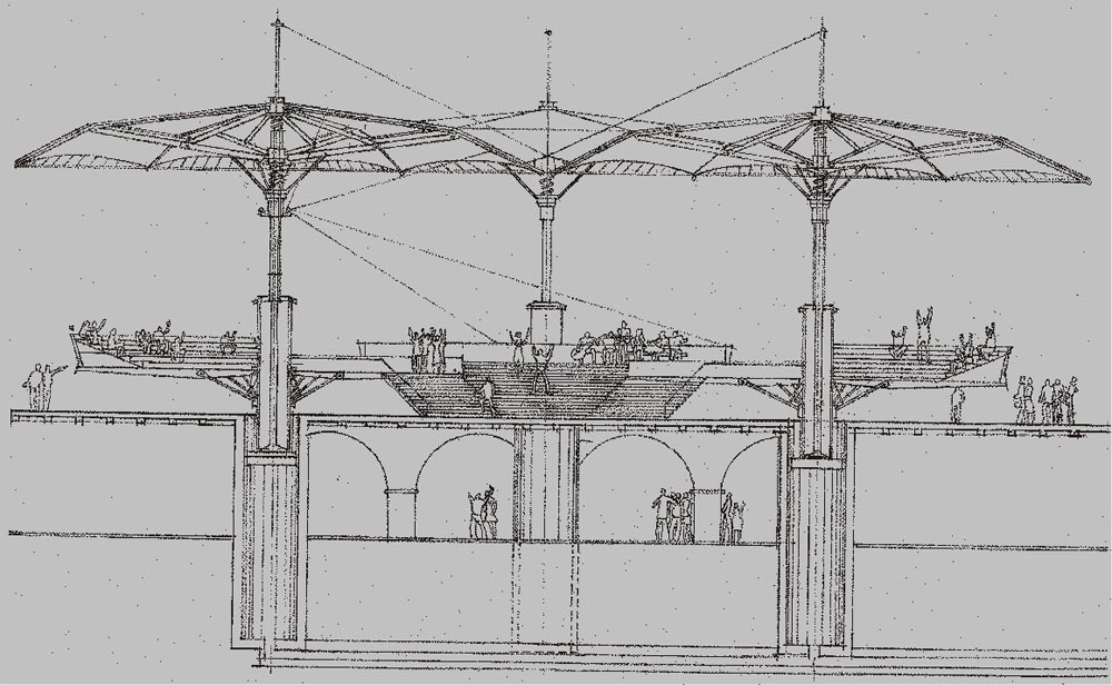 По каркасу несучих консолей нижнього рівня укладаються прозорі пластикові щити.а на них трибуни, огорожі щитів,квітники, тощо. На рівні 9м натягуються троси несучого каркасу світлотехнічноі системи “STELLARIA” фірми “ TARGETTI”.