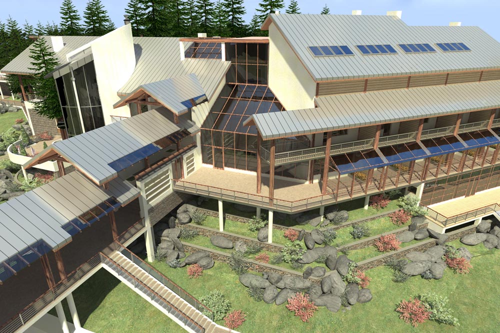Сходи з'єднують пішохідний критий міст через р. Жонка і партерний сад першої пойменної тераси по домінантній осі, ведучій до спальних корпусів санаторію. Декоративне накриття сходів має свою, не зв'язану з спальним корпусом несучу кон- струкцію, виконану в металодерев'яному каркасі з даховим накриттям фірми “Reynzink” по фермам з круглого бруса.