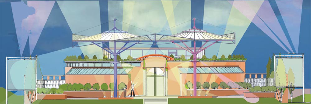 Білосніжні гіганські “парасолі-кульбабки”, як у казці “Незнайка в краіні квітів”-накривають співочих дітей ,захищаючи від сонячноі спеки-влітку,від дощу-восени. Підсилюють образ “краіни квітів”рясно уквітчана декоративними чагарниками червоно-коричнева стінка огородження куліс,накрита зверху прозорим дашком. Ще вище- з відступом,створюючи образ терасованоі червоноглиняноі гори,зарослоі декоративними чагарниками запроектований блок артистичних вбирален з кафетерієм. Майже під самим дашком –тентом “кульбабок” на вершині "цієі гори” рясно виростають найпишніші ,найяскравіші квіти терасного саду –кафетерію. Розрізає нижню терасу навпіл по центральній осі головного виходу на сцену –“грот”, створений симетричними стінками куліс . Рекреаційно-відпочинкова функція співочого комплексу надихає образи ландшафного характеру максимально наближені до оточуючого природного середовища.
