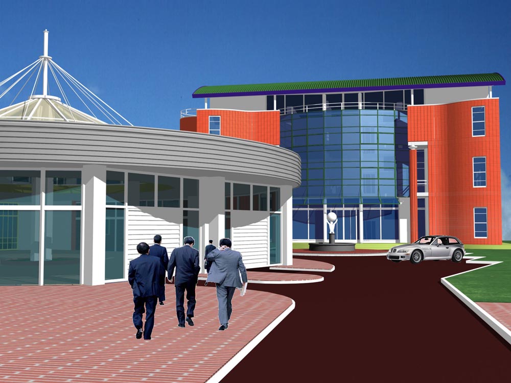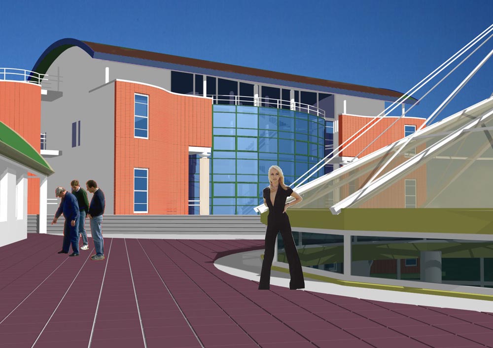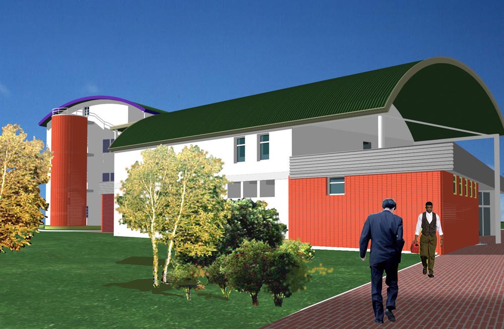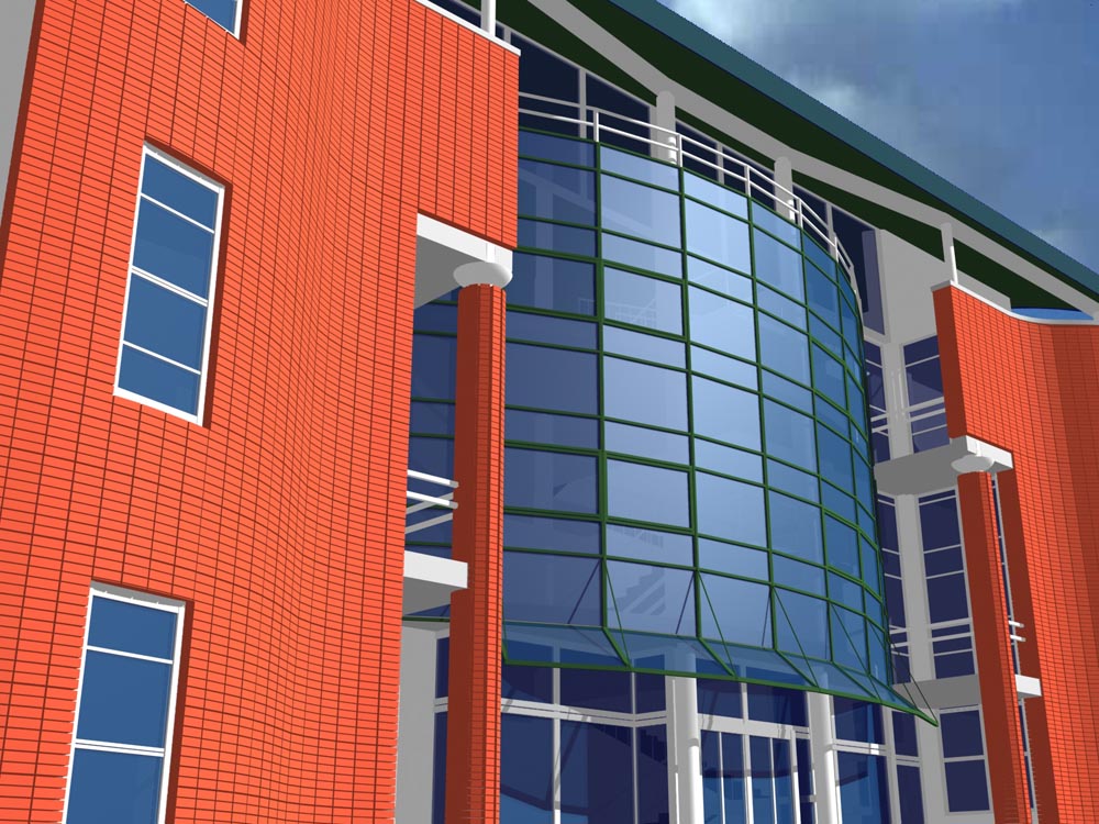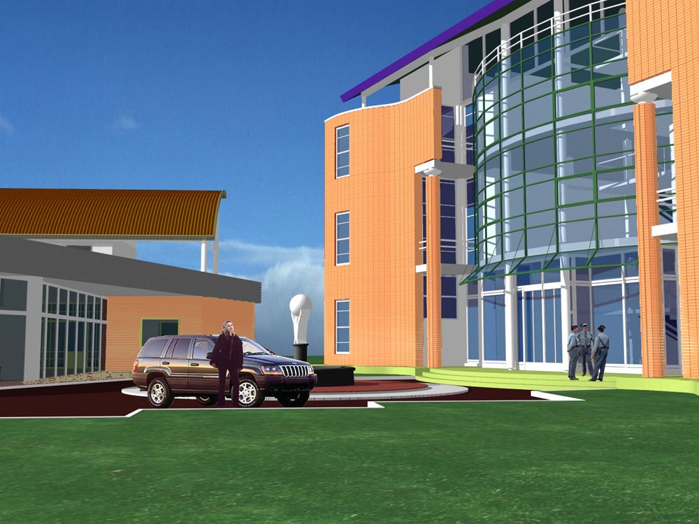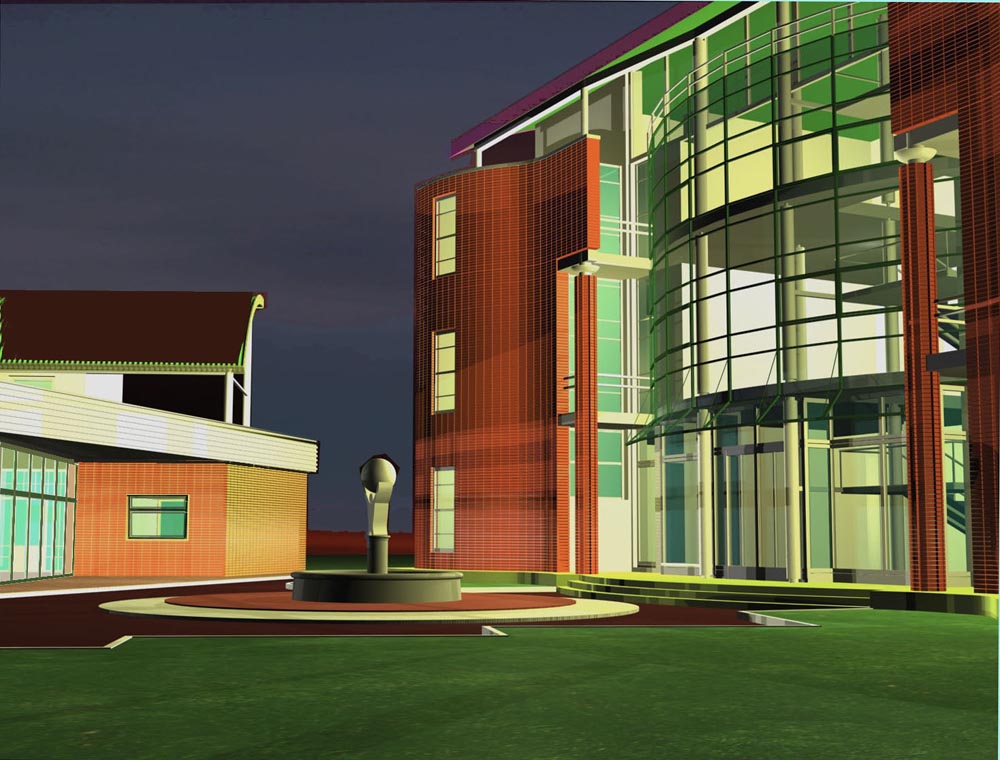Архітектурний образ триповерховоі споруди адмінуправління по бажанню замовника мав носити індивідуальний пластичний характер.Матеріалами обличкування фасадів вибрана личкова світлотерракотова цегла в поєднанні з білими колонами зеле з білими колонами і зелено - блакитним кольором вітражів фасадноі системи.