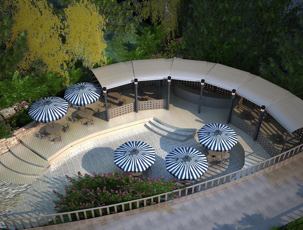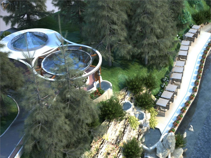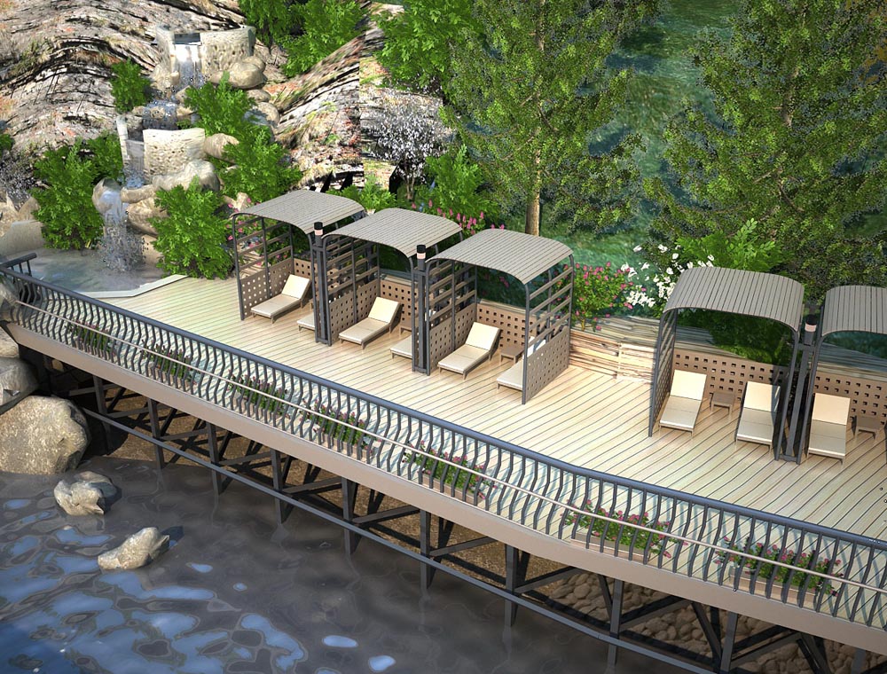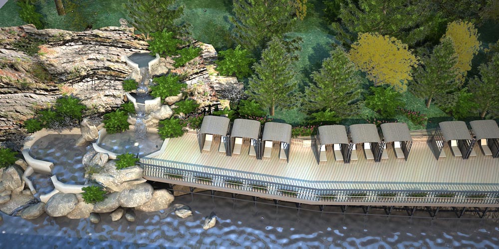 Створення пейзажно-лікувальноі зони аерарію має на меті оздоровлення відпочиваючих особливостями шумотерапіі стрімких водних перекатів гірськоі ріки Жонка. Планшет дерев'яного решітчастого настилу аерарію на якому розставлені лежаки для лікувального відпочинку запроектований на палевій конструкціі з трубостійок Ф300мм, яка примикає до конструкціі берегоукріплення, виконаноі з габіонних блоків. На вістрії тристороннього периметру планшету настилу, до конструкціі габіонного берегоукріплення примикають забетоновані між собою велики брили каміння в формі клину (в плані). Вони приймають на себе динаміку водяних потоків ріки створюючи шум.