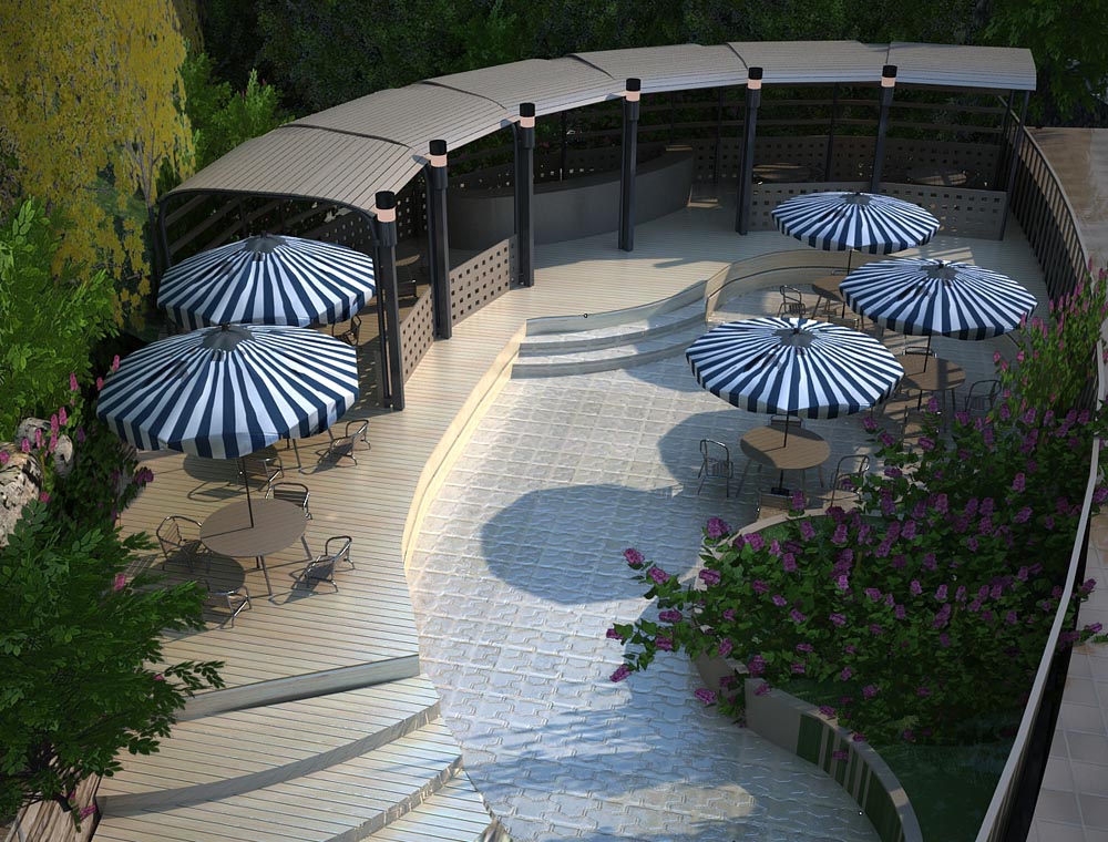 Ця зона має нижній сад прибережноі рослинності і кам'яний сад на підпірних стінках схилу.з деревяною перголою над лежаками.