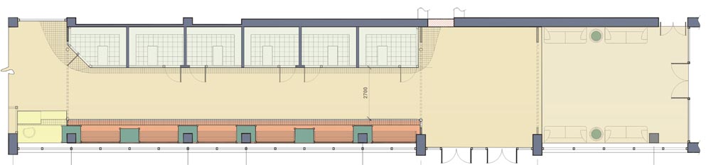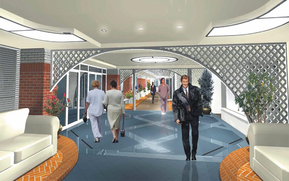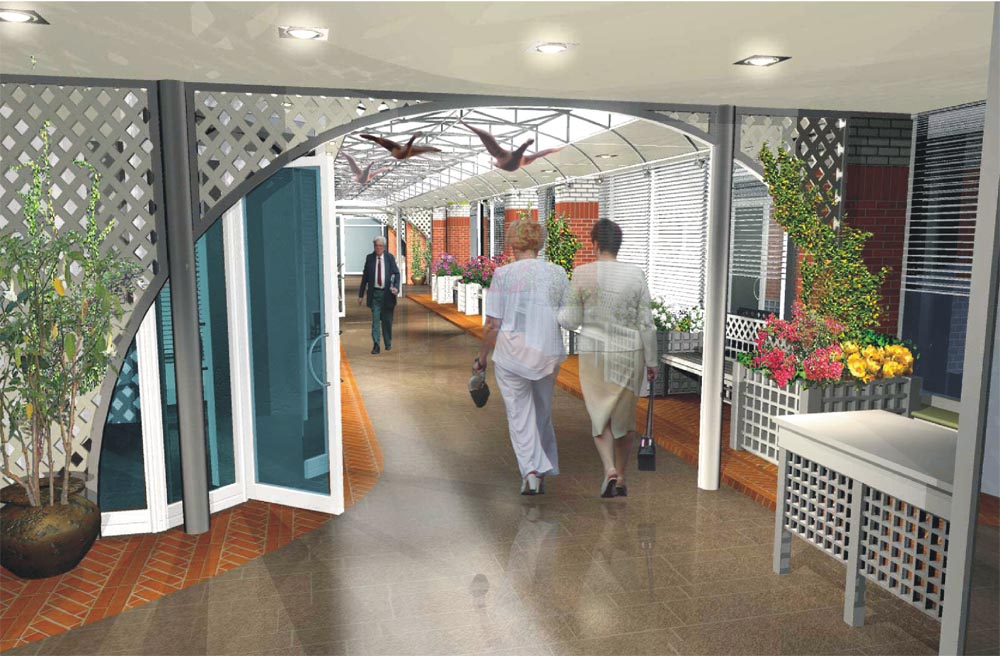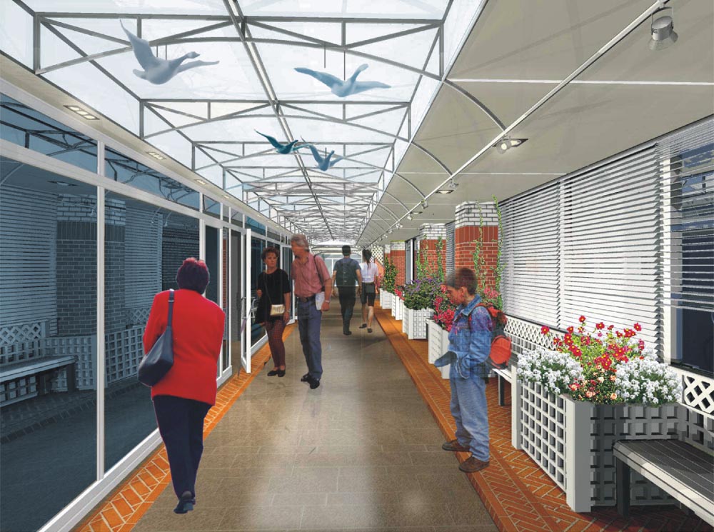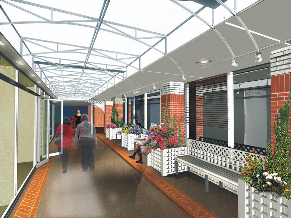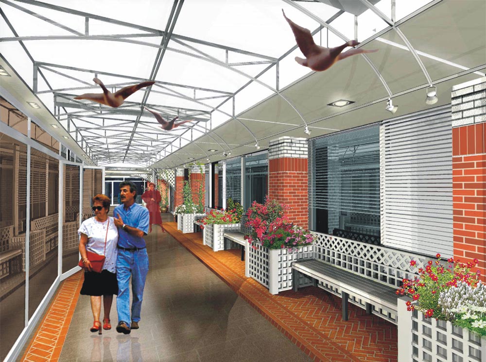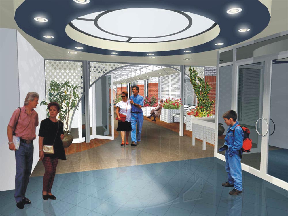 Проектом передбачено створення озелененого "торгового пасажу" зі всіма атрибутами "вулиці" -верхнім світловим ліхтарем,який візуально збільшує простір холу та створює враження безхмарного неба над головою, парковими диванами, квітниками і летючими птахами над головою.