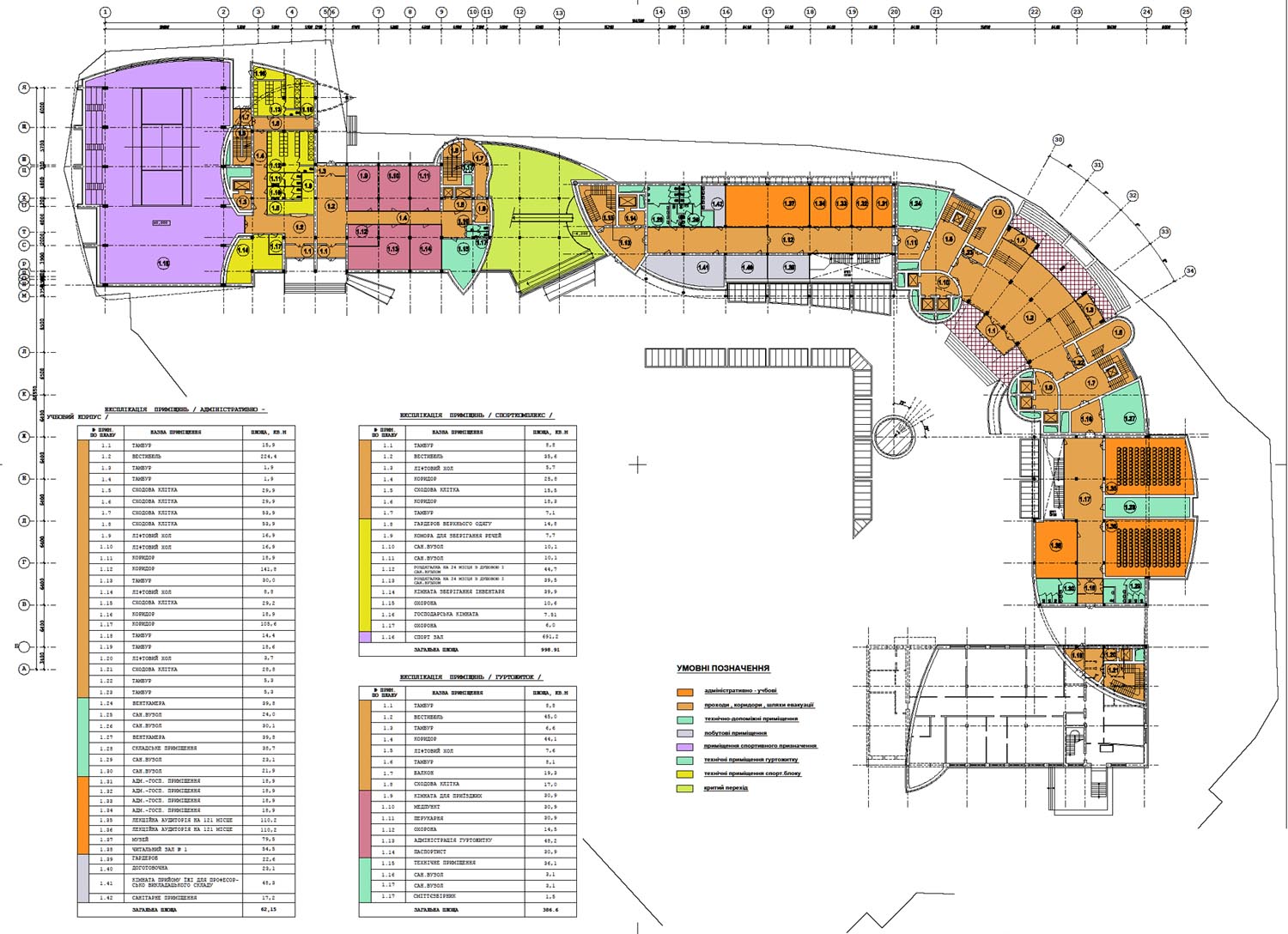 Три тренувальних зали по 1000м2 на 1-ому,2-му і 3-ому поверхах з снарядними, гардеробними кімнатами,кімнатами для зберігання спортивного інвентарю,душовими і санвузлами,кабінетами тренерів і антресолями з місцями для вболівальників.